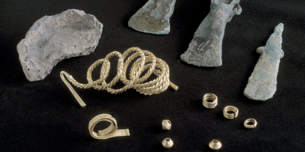 Tonscherbe, Bronzeäxte, Goldschmuck: Hortfund von Burton, Wrexham, Nordost-Wales. CAROLINE BARTON, THE PORTABLE ANTIQUITIES SCHEME, LONDON (CC BY-SA)