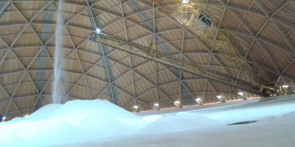 Der «Saldome 2», die 2012 fertiggestellte kuppelförmige Salzlagerhalle der Schweizer Rheinsalinen. BRENNEISEN