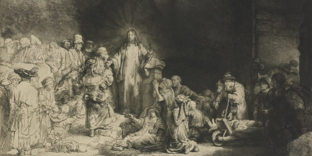 Dabei erzählt das «Hundertguldenblatt» doch eine vollkommen andere Geschichte. Der Kupferstich zeigt Jesus, leuchtend und erhaben vor dem tiefen Dunkel menschlichen Elends, der dabei ist, zu ihm pilgernde Kranke zu heilen. Eine Mutter hält ihm flehend ihr Kind entgegen, Männer und Frauen jeden Alters bitten um Erlösung von ihren Leiden, knieend oder liegend, einer wird gar auf einer Schubkarre herbeigerollt. Eine Menschenmenge im Hintergrund betrachtet die Szene mit Skepsis – es heisst, die sorgfältig ausgearbeiteten Gesichter stellten wohlhabende Amsterdamer dar, deren ein jeder, wen wundert’s, ebenfalls 100 Gulden dafür gezahlt haben soll, vom grossen Meister in einem seiner Werke verewigt zu werden.