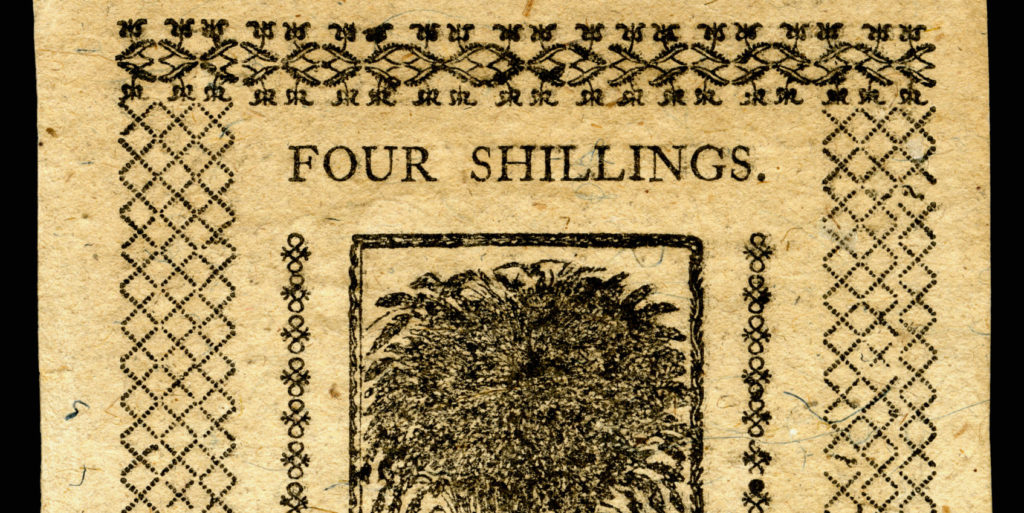 Rückseite einer Vier-Schilling-Note der Delaware Colony mit der aufgedruckten Warnung «Fälschen bedeutet den Tod» (1776). NATIONAL MUSEUM OF AMERICAN HISTORY, WASHINGTON, D.C.