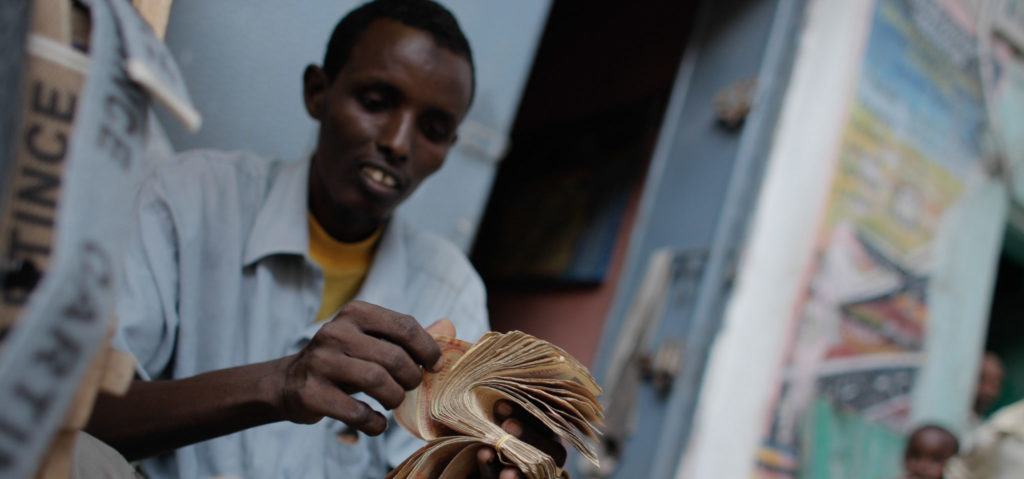 Geldwechsler beim Zählen somalischer Schillingnoten in Mogadischu (2013). MISSION DER AFRIKANISCHEN UNION IN SOMALIA