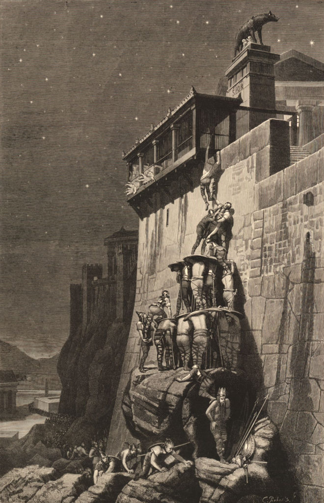 Die Rettung des Kapitols durch die heiligen Gänse der Juno. Holzschnitt von Charles Roberts (1883) nach einem verschollenen Gemälde von Henri Paul Motte.